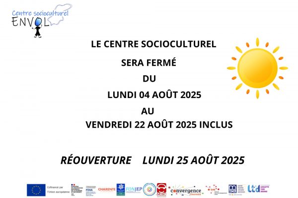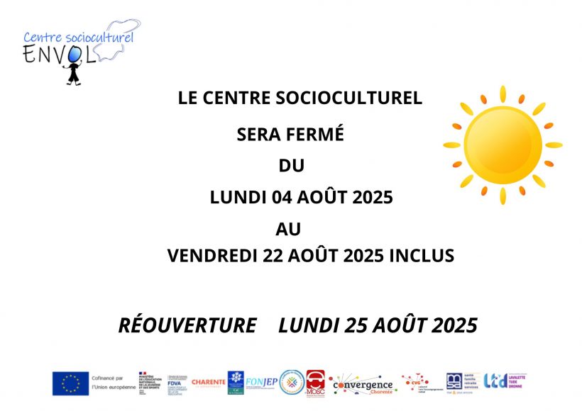 Les bureaux du Centre socioculturel ENVOL ainsi que le centre de Loisirs de Champlong seront fermĂ©s du 4 au 22 aoĂ»t 2025 inclus. Le service de transport Ă la demande fonctionnera sur cette pĂ©riode et il est joignable au : 07 82 32 76 33 Bonnes vacances si vous y ĂȘtes et surtout bel Ă©tĂ© […]