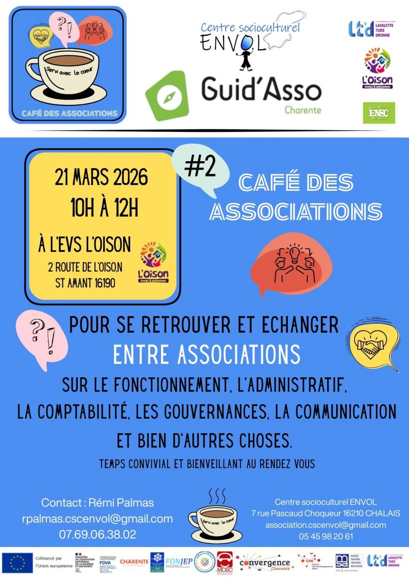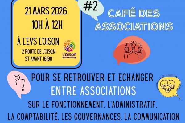 Samedi 31 janvier entre 10h et 12h , Rémi vous attendra au sein de l’association l’Oison à Montmoreau, pour le 1er café des associations. Un temps d’échanges sur les difficultés potentiellement rencontrées par les assos et aussi pour partager toutes les réussites !! Merci à tous de relayer l’information !
