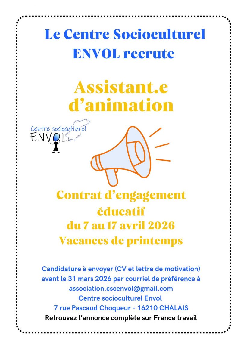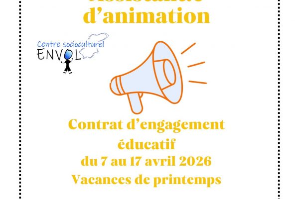 Le CSC ENVOL recherche un assistant.e d’animation en contrat d’engagement éducatif pour les vacances de printemps au centre de loisirs, 9 jours du 7 au 17 avril 2026. Le BAFA est obligatoire. Si vous êtes disponible, si vous recherchez un job de vacances, postulez vite !