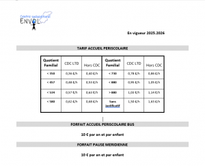 Le tarif horaire est adapté en fonction du quotient familial. Il est facturé au plus juste mais le logiciel pratique un arrondi au quart d’heure sur le temps de présence.
