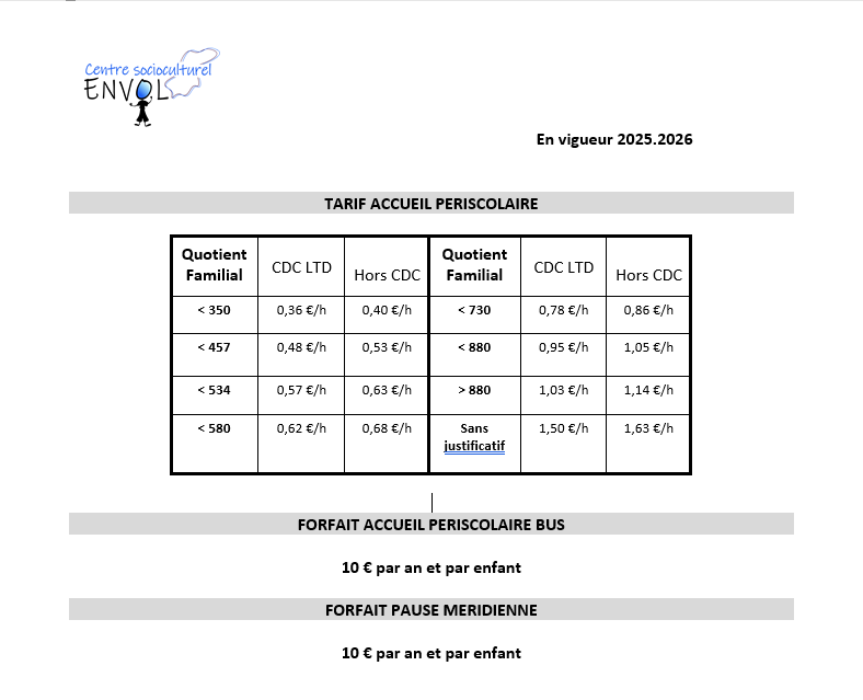Le tarif horaire est adapté en fonction du quotient familial. Il est facturé au plus juste mais le logiciel pratique un arrondi au quart d’heure sur le temps de présence.