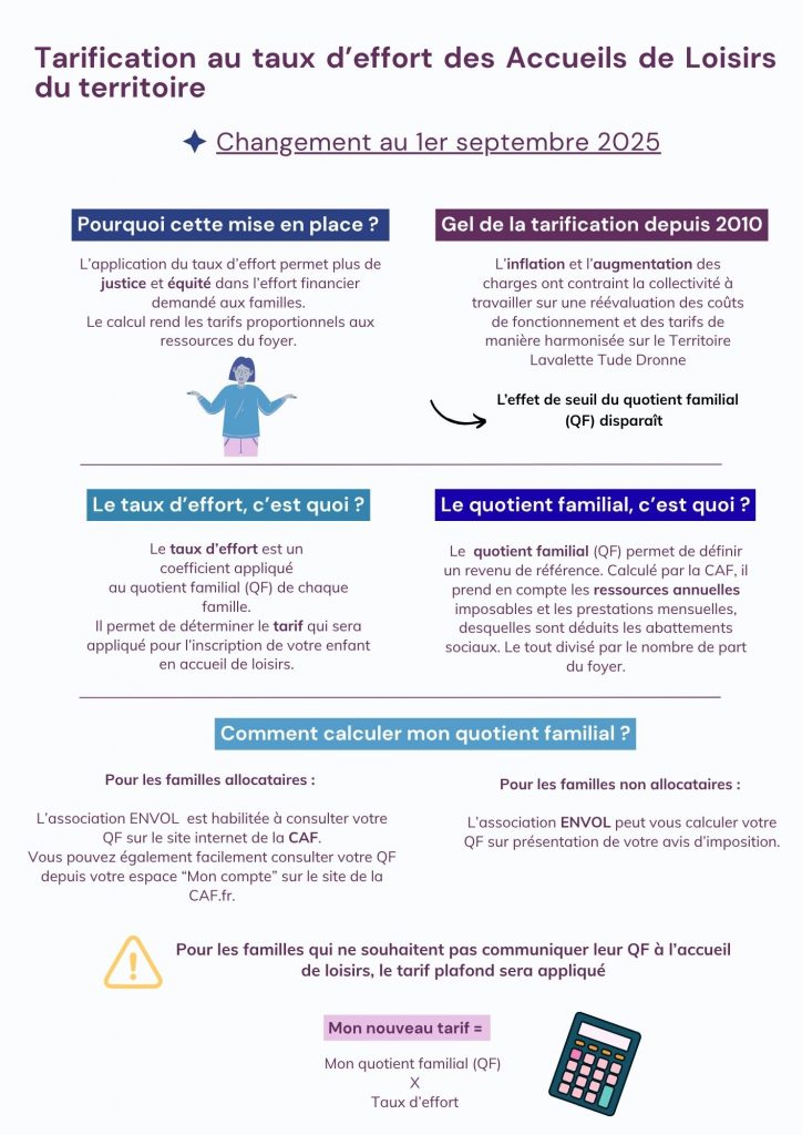 La communauté de communes Lavalette Tude Dronne a souhaité que soit mise en place une harmonisation des tarifs sur le territoire. Le tarif appliqué à l’heure sera désormais calculé avec un taux d’effort, c’est à dire un coefficient appliqué  directement à votre quotient familial. Ce tarif sera encadré par un prix plancher (minimum/heure) et un prix plafond (maximum/heure).